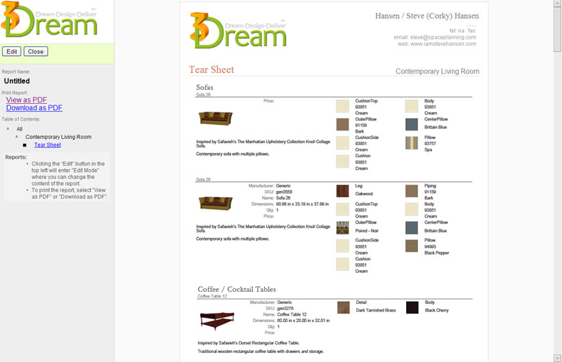 - 3Dream users creating room plans with your products can generate and print shopping lists